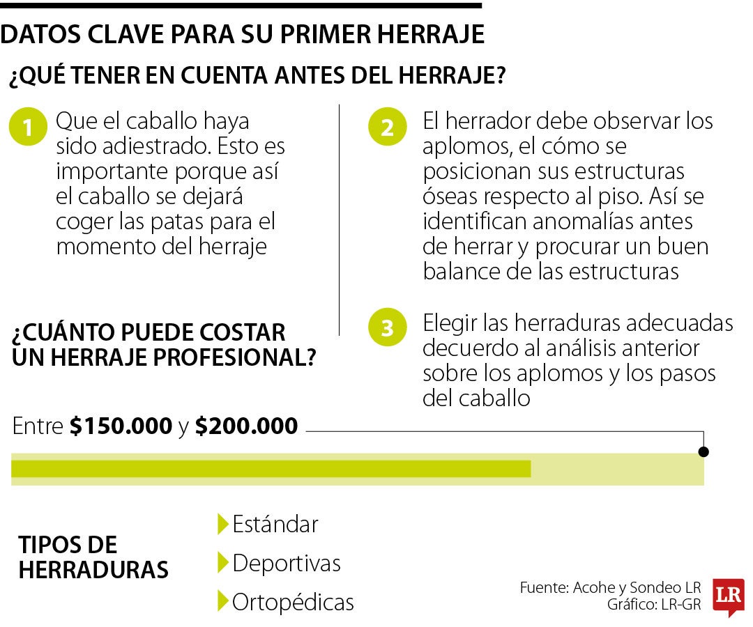 Raúl Ernesto Sánchez, director ejecutivo de la Asociación Colombiana de Herradores, Acohe, explicó tres pasos previos al herraje que son fundamentales. El primero tiene que ver con el adiestramiento del caballo, pues se le enseña a que coger sus patas no representa un peligro, algo indispensable al momento del herraje.