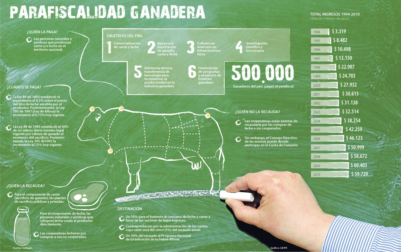 En ese entonces la cuota que debían pagar los productores por este concepto, era el equivalente al 0.5% sobre el precio del litro de leche vendida por el productor y al 50% de un salario diario mínimo legal vigente, por cabeza de ganado al momento del sacrificio.