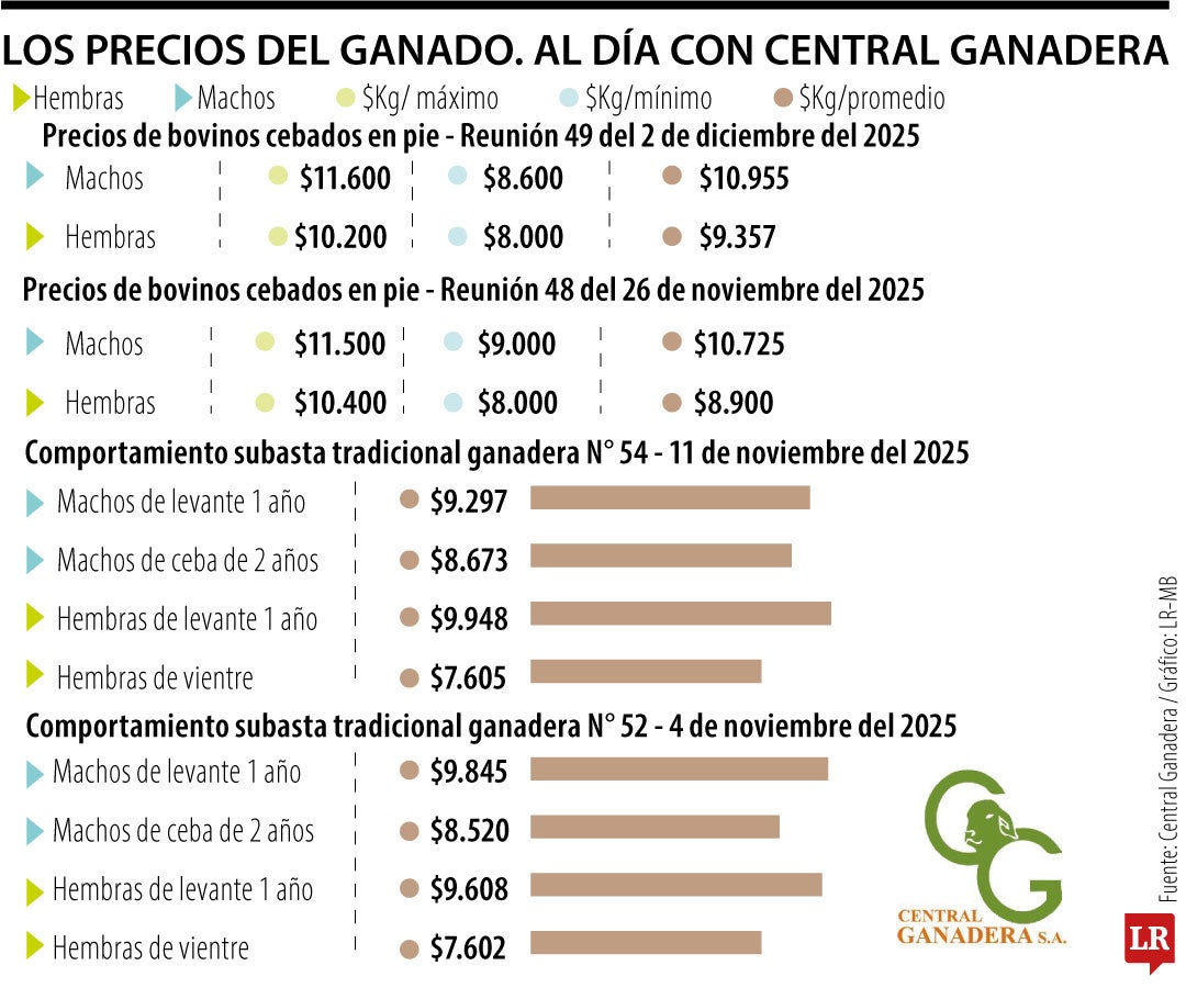 Esta semana se tuvo la Subasta Tradicional Ganadera número 58, que también se realizó el martes 2 de diciembre. En la categoría de machos de levante de un año, el precio promedio por kg fue de $9.297, mientras que el de macho de ceba de dos años fue de $8.673. Por su parte, el precio promedio del kilo de hembras de levante de un año fue de $9.948, y el de hembras de vientre de $7.605.