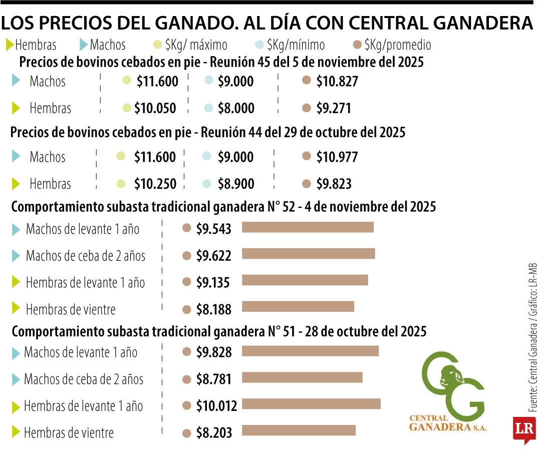 Esta semana se tuvo la Subasta Tradicional Ganadera número 52, que se realizó el martes. En la categoría de machos de levante de un año, el precio promedio por kg fue de $9.543, mientras que el de macho de ceba de dos años fue de $9.622. Por su parte, el precio promedio del kilo de hembras de levante de un año fue de $9.135, y el de hembras de vientre de $8.188.