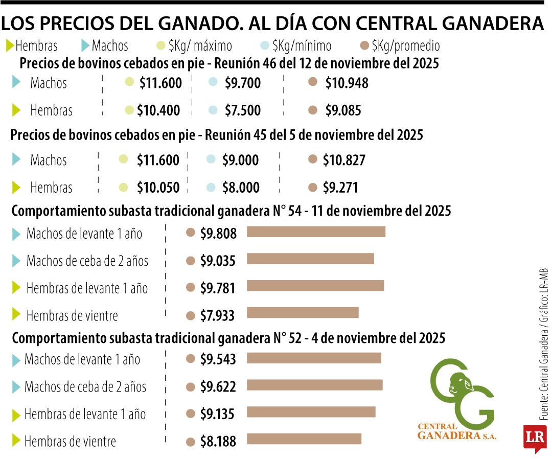 Esta semana se tuvo la Subasta Tradicional Ganadera número 54, que se realizó el martes 11 de noviembre. En la categoría de machos de levante de un año, el precio promedio por kg fue de $9.808, mientras que el de macho de ceba de dos años fue de $9.035. Por su parte, el precio promedio del kilo de hembras de levante de un año fue de $9.781, y el de hembras de vientre de $7.933.