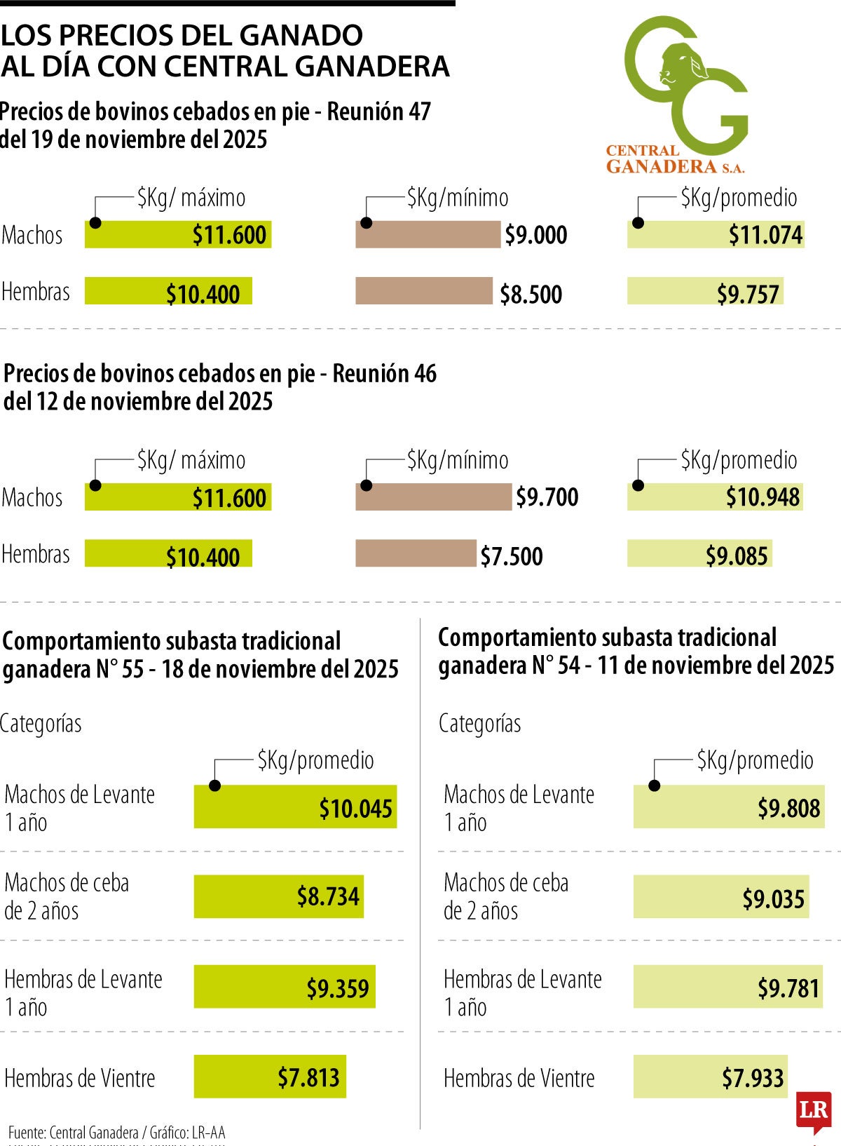 Esta semana se tuvo la Subasta Tradicional Ganadera número 55, que se realizó el martes 18 de noviembre. En la categoría de machos de levante de un año, el precio promedio por kg fue de $10.045, mientras que el de macho de ceba de dos años fue de $8.734. Por su parte, el precio promedio del kilo de hembras de levante de un año fue de $9.359, y el de hembras de vientre de $7.813.