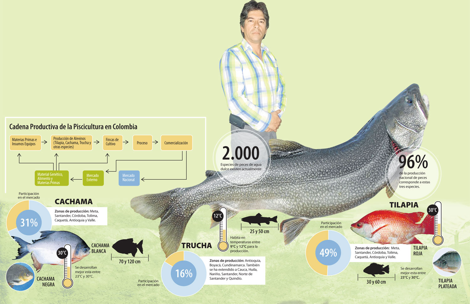 Actualmente, en el mercado nacional de la piscicultura, el 96% de la producción corresponde a la cachama (23°C y 30°C), trucha (9°C y 12°C) y la tilapia (22°C y 32°C).