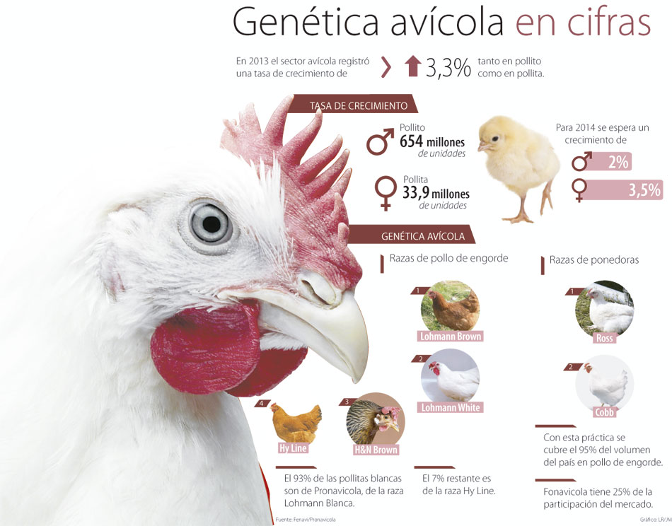 En la genética de pollos para engorde hay dos razas principales que se comercializan en el país: la Ross, la cual es representada por empresas como Pronavícola y Avícola Colombiana, y la Cobb, que es representada por Incubadora Colombiana y Agroavícola San Marino.