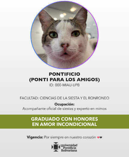 La Universidad Pontificia Bolivariana sorprendió a su comunidad al rendir un homenaje a Pontificio, un gato que durante años recorrió los pasillos del EcoCampus y se convirtió en parte del paisaje cotidiano para cientos de estudiantes.