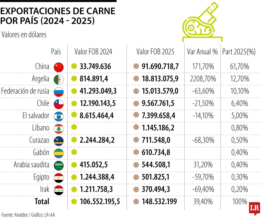 Según el análisis realizado por Analdex, las exportaciones de carne bovina vivieron un crecimiento en 2025 alcanzando los US$148,5 millones, lo que representó un incremento de 39,4% en comparación con 2024. Este incremento se debe en gran medida a la apertura del mercado chino, destino que se ha consolidado como líder al absorber 61,6% del total con 18.769 toneladas. Cerrar las fronteras comerciales en este punto no solo afectaría la entrada de divisas, sino que pondría en riesgo la credibilidad internacional del país como proveedor estable no solo ante el país asiático sino también en mercados claves como Rusia y Argelia que representan 11,8% y 11,3% de las toneladas exportadas respectivamente.
