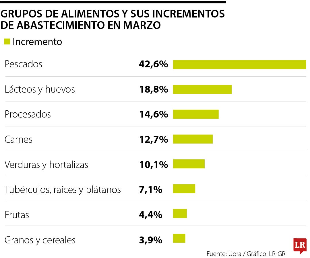 El grupo de alimentos que más incremento registró, frente a marzo de 2025 fue el pescado con un aumento de 42,6%, por la alta demanda que tuvo en semana santa. En segundo lugar, con un aumento de 18,4% se posicionaron los lácteos y huevos, y en tercer lugar los procesados con 14,6%.