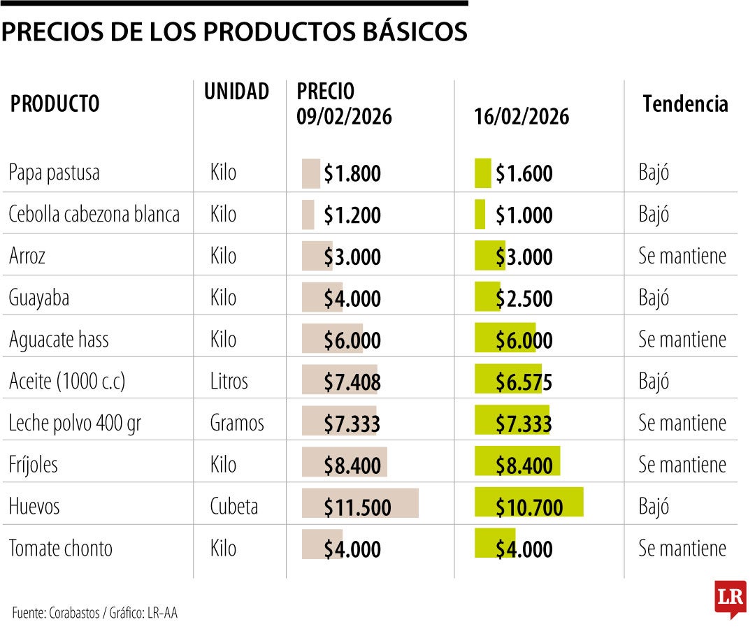 Para hoy, la guayaba bajó $1.500, al pasar de $4.000 a $2.500. Lo acompañaron productos como la papa pastusa y la cebolla cabezona blanca con bajas de $200, y los huevos (-$800). El aceite también siguió la tendencia de los otros productos y bajó su precio de $7.408 a $6.575.