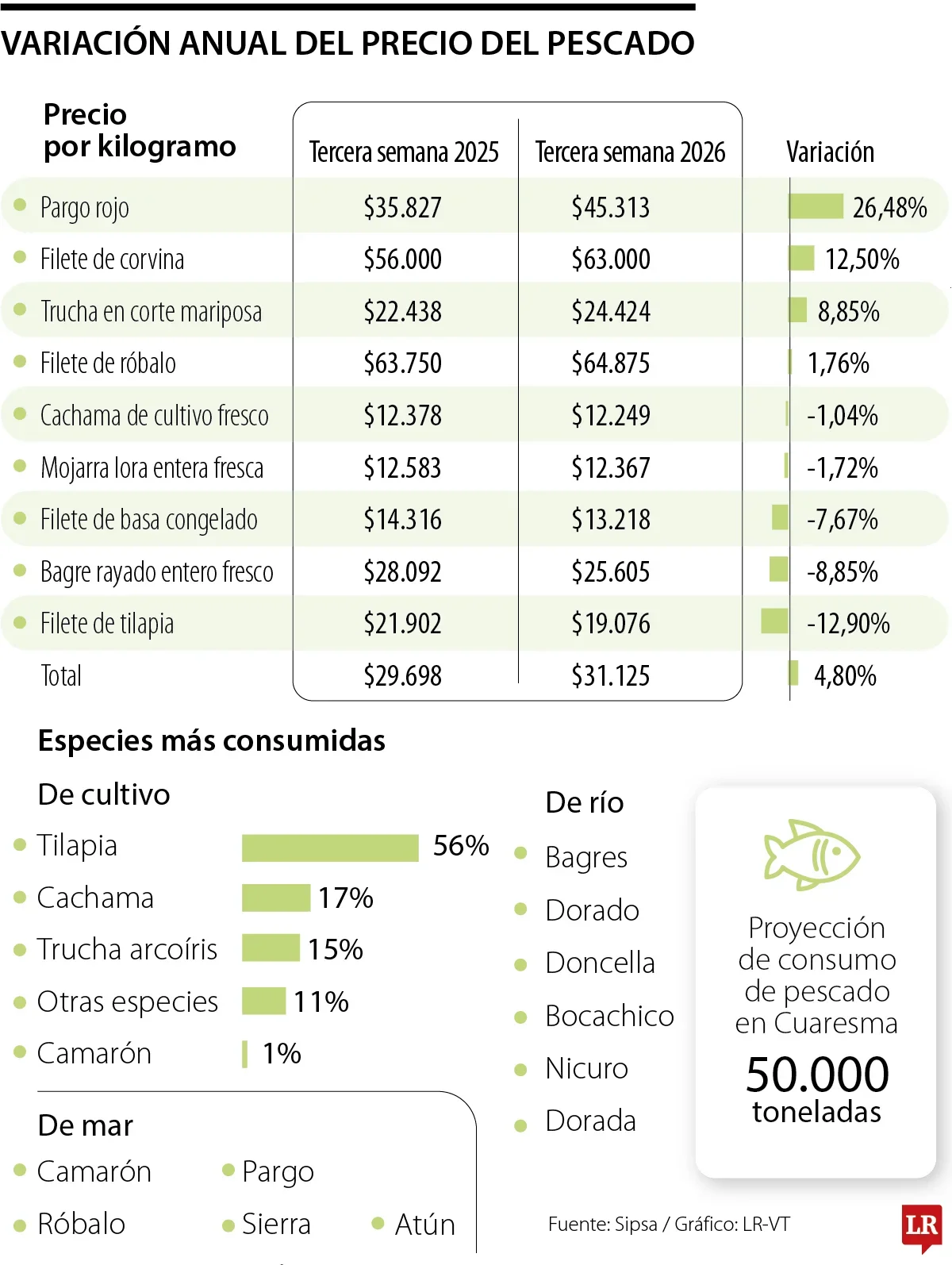 Durante la Cuaresma, el consumo de pescado aumenta cerca de 50% frente al resto del año, lo que impulsa tanto la producción como los precios. Para esta temporada, se proyecta una demanda cercana a las 50.000 toneladas, por encima del rango histórico de entre 40.000 y 45.000 toneladas.