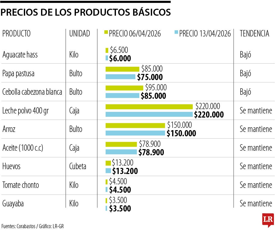 El resto de alimentos se mantuvieron estables, por lo que el bulto de arroz sigue en $150.000, el kilo de guayaba en $3.500, el kilo de tomate chonto en $4.500, la caja de aceite en $78.900, la leche en $220.000 y la cubeta de huevos en $13.200.