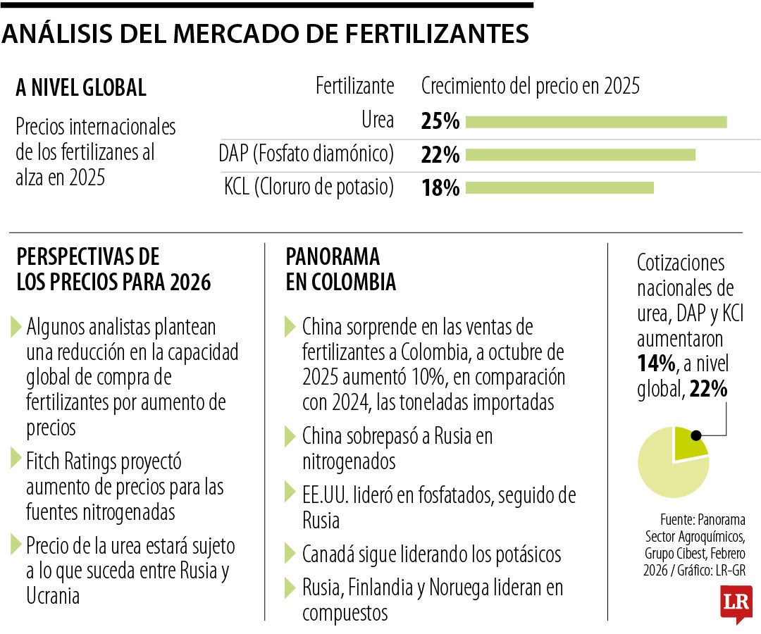 El informe sobre el Panorama Sector Agroquímicos del Grupo Cibest, mostró las proyecciones del mercado de fertilizantes para 2026, tanto a nivel global como local, teniendo en cuenta diferentes causas geopolíticas y de mercados que podrían influir en los precios para este año.