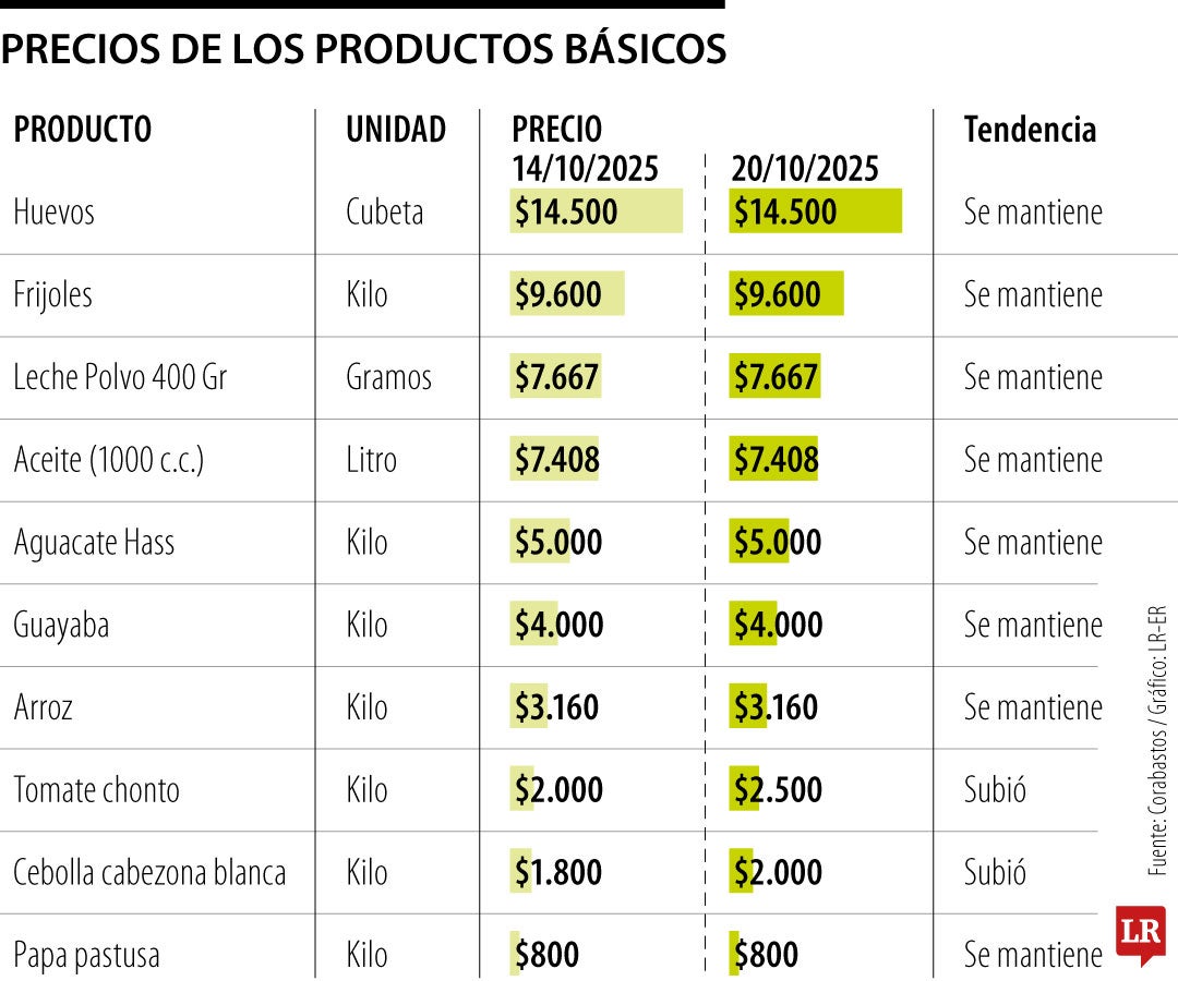 Para esta ocasión, el kilo de dos alimentos tuvo incrementos: el de cebolla cabezona blanca y el de tomate chonto, que con variaciones de $200 y $500 iniciaron la semana en $2.000 y $2.500. El resto de los alimentos se mantuvieron estables, por lo que el kilo de papa pastusa sigue en $800, el de arroz en $3.160 y el de guayaba en $4.000.