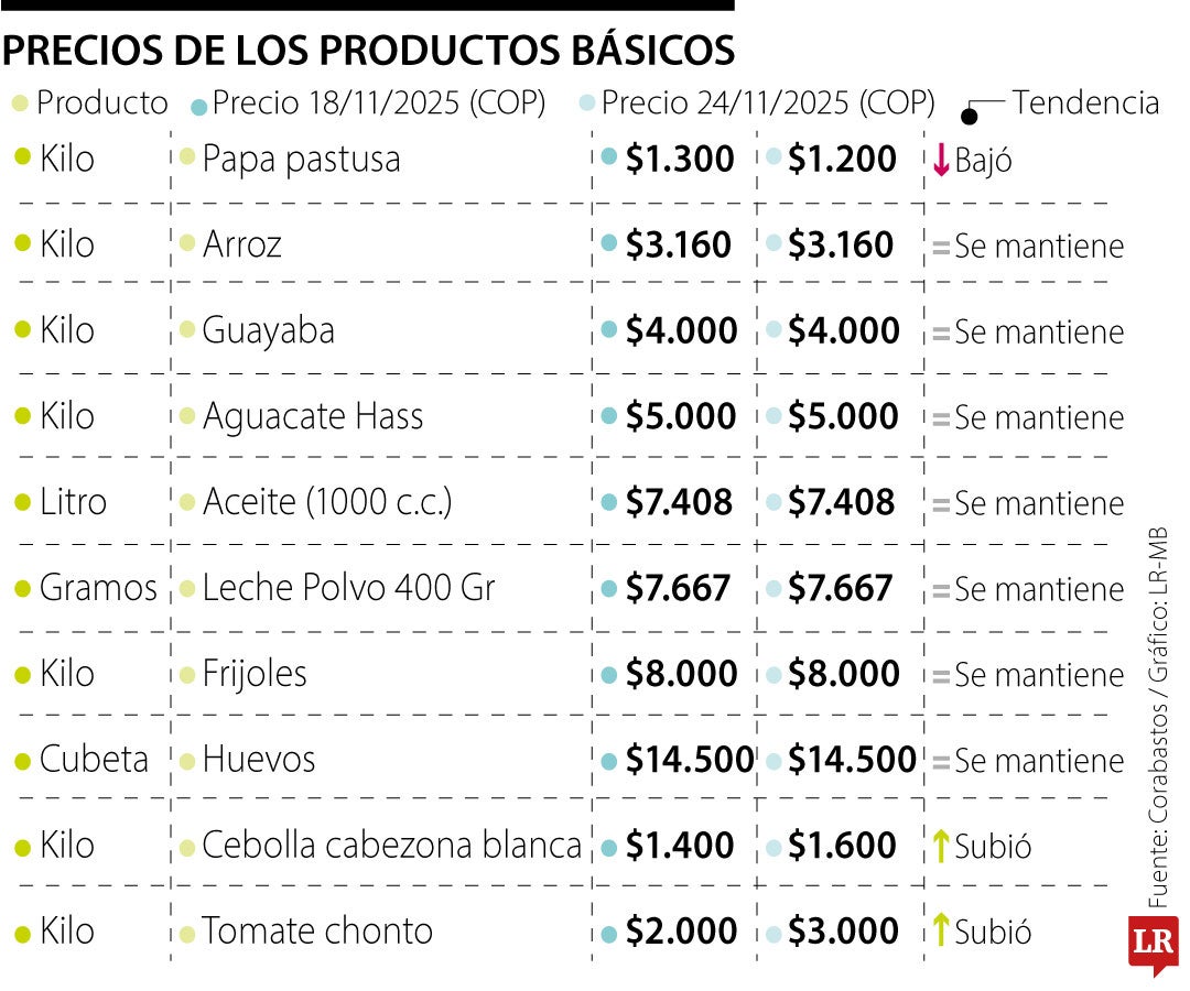 De acuerdo con el boletín diario de precios publicado por Corabastos, la central de abasto de Bogotá, publicado durante la mañana, estos son los alimentos que bajaron, subieron y mantuvieron estables sus precios para esta semana, del 24 al 28 de noviembre.