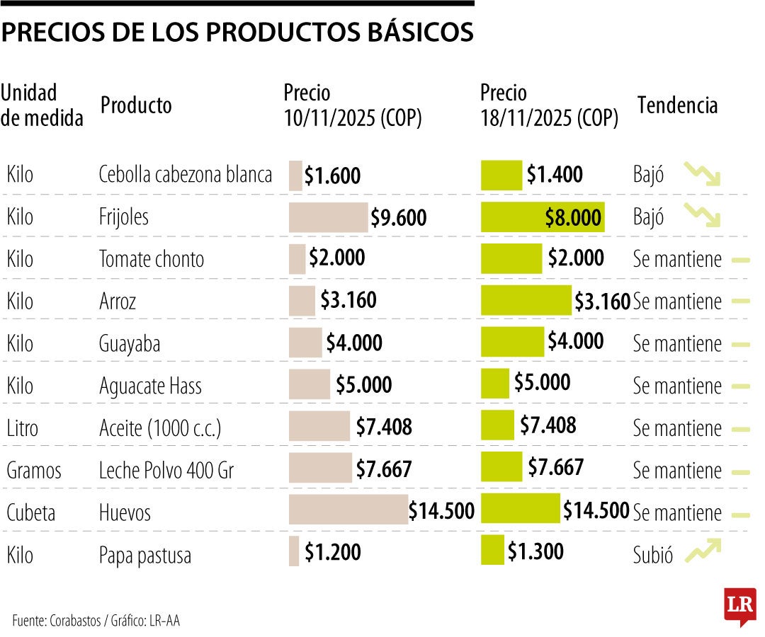 De acuerdo con el boletín diario de precios publicado por Corabastos, la central de abasto de Bogotá, publicado durante la mañana, estos son los alimentos que bajaron, subieron y mantuvieron estables sus precios para esta semana, del 18 al 21 de noviembre.