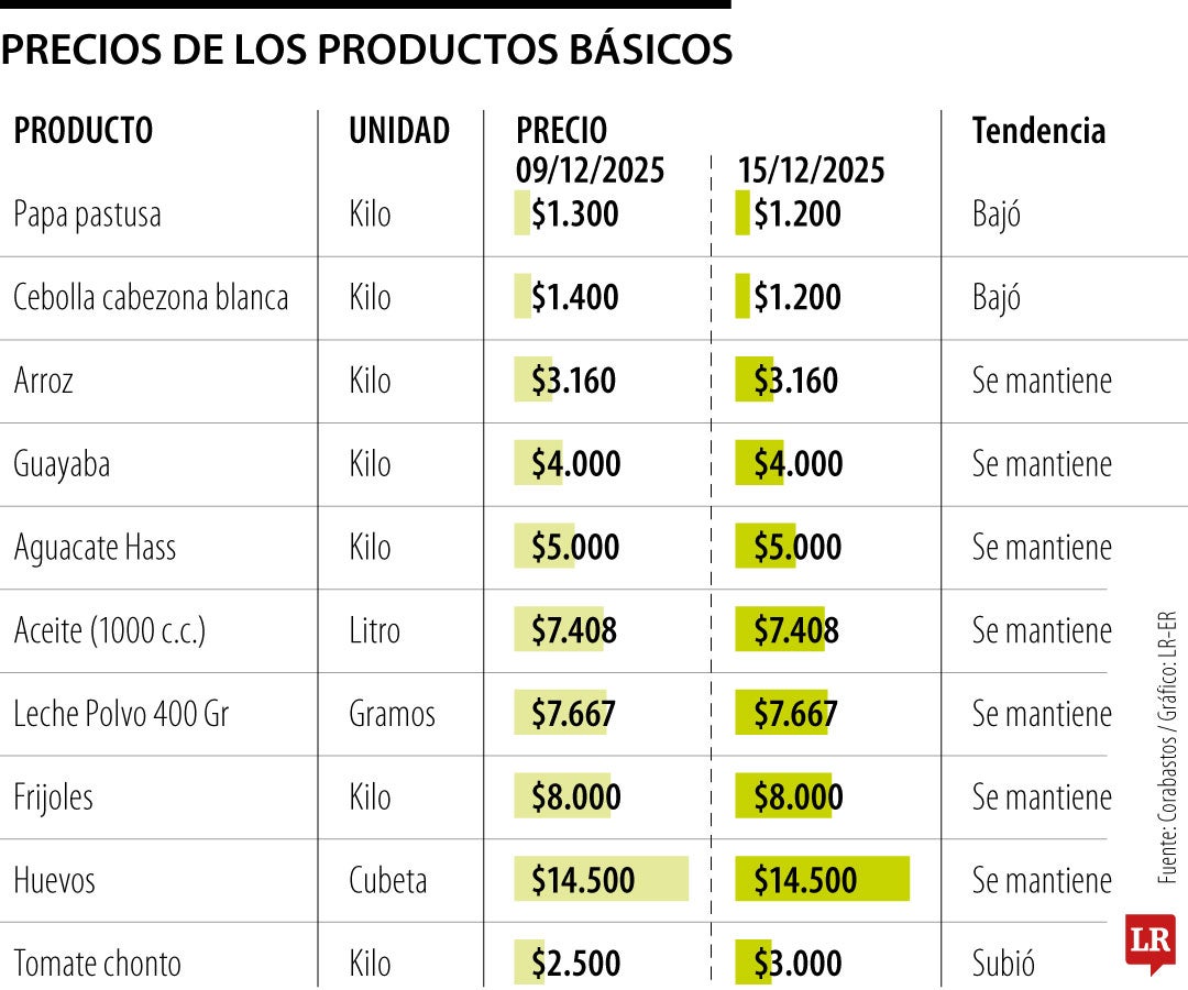 La semana comenzó con algunos cambios en los precios de los alimentos básicos de la canasta familiar colombiana, con respecto al martes 9 de diciembre.