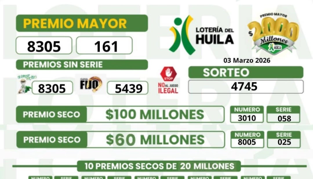 Por otro lado, la lotería del Huila entregó su premio mayor, de $2.000 millones, al número 8305 de la serie 161. Además, entregaron secos de $100, $60 y $20, $10 millones.