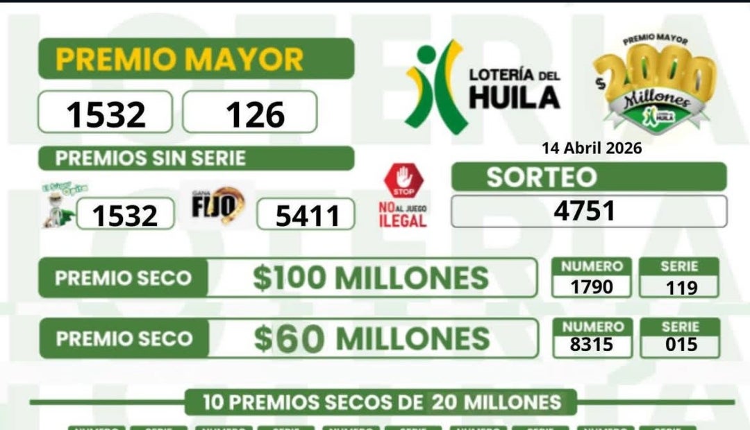 Por otro lado, la lotería del Huila entregó su premio mayor, de $2.000 millones, al número 1532 de la serie 126. Además, entregaron secos de $100, $60 y $20, $10 millones.