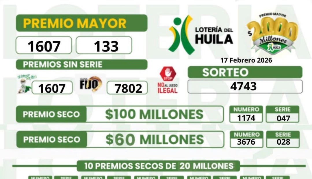 Por otro lado, la lotería del Huila entregó su premio mayor, de $2.000 millones, al número 1607 de la serie 133. Además, entregaron secos de $100, $60 y $20, $10 millones.