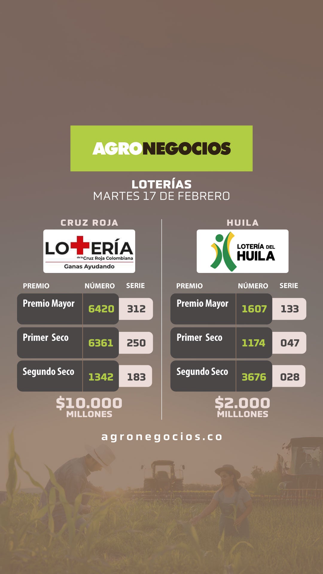 Durante la noche del martes 17 de febrero se realizaron los sorteos 3141 de la lotería de la Cruz Roja y 4743 de la lotería del Huila, con premios mayores de $10.000 y $2.000 millones. A la vez, los sorteos tuvieron premios secos de $200, $100, $60, $50, $30, $20 y $10 millones.