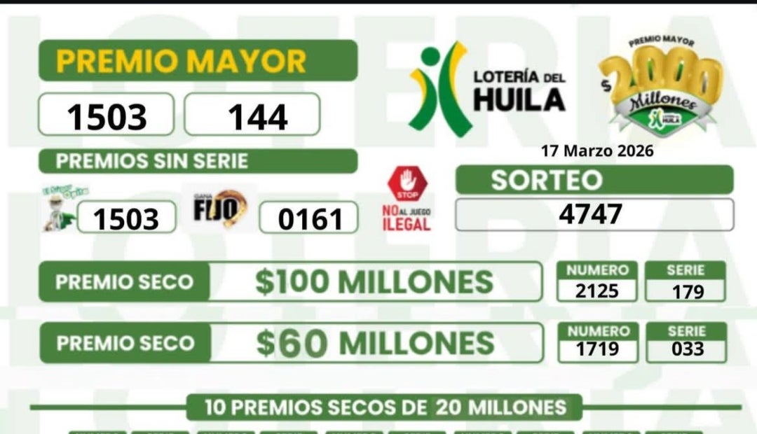 Por otro lado, la lotería del Huila entregó su premio mayor, de $2.000 millones, al número 1503 de la serie 144. Además, entregaron secos de $100, $60 y $20, $10 millones.