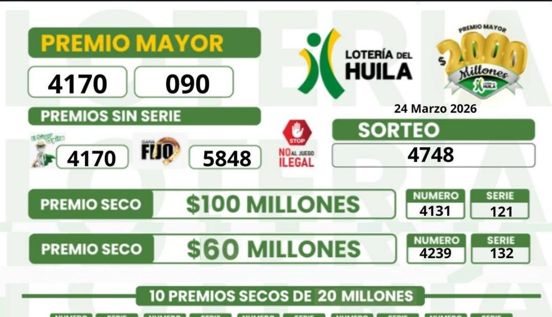 Por otro lado, la lotería del Huila entregó su premio mayor, de $2.000 millones, al número 4170 de la serie 090. Además, entregaron secos de $100, $60 y $20, $10 millones.