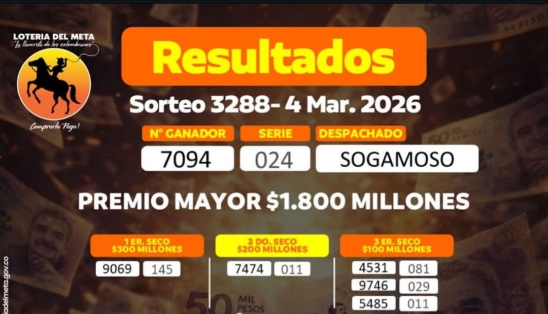 Por último, para la lotería del Meta, el número que se llevó el premio mayor, de $1.800 millones, fue el 7094 de la serie 024. A la vez se entregaron secos de $300, $200, $100, $50, $20 y $10 millones.