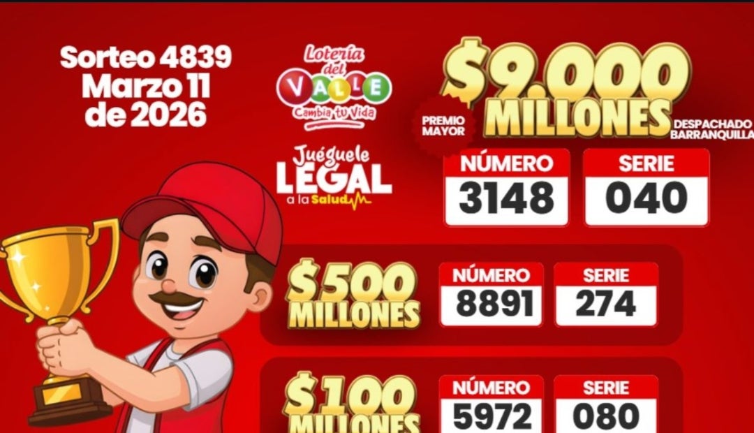 Durante la noche del miércoles 11 de marzo se realizaron los sorteos 4839 de la lotería del Valle, 4946 de la lotería de Manizales y 3289 de la lotería del Meta, con premios mayores de $9.000, $2.600 y $1.800 millones. Esto sin olvidar los secos de $300, $200, $100, $80, $60, $50, $40, $30, $20 y $10 millones.
