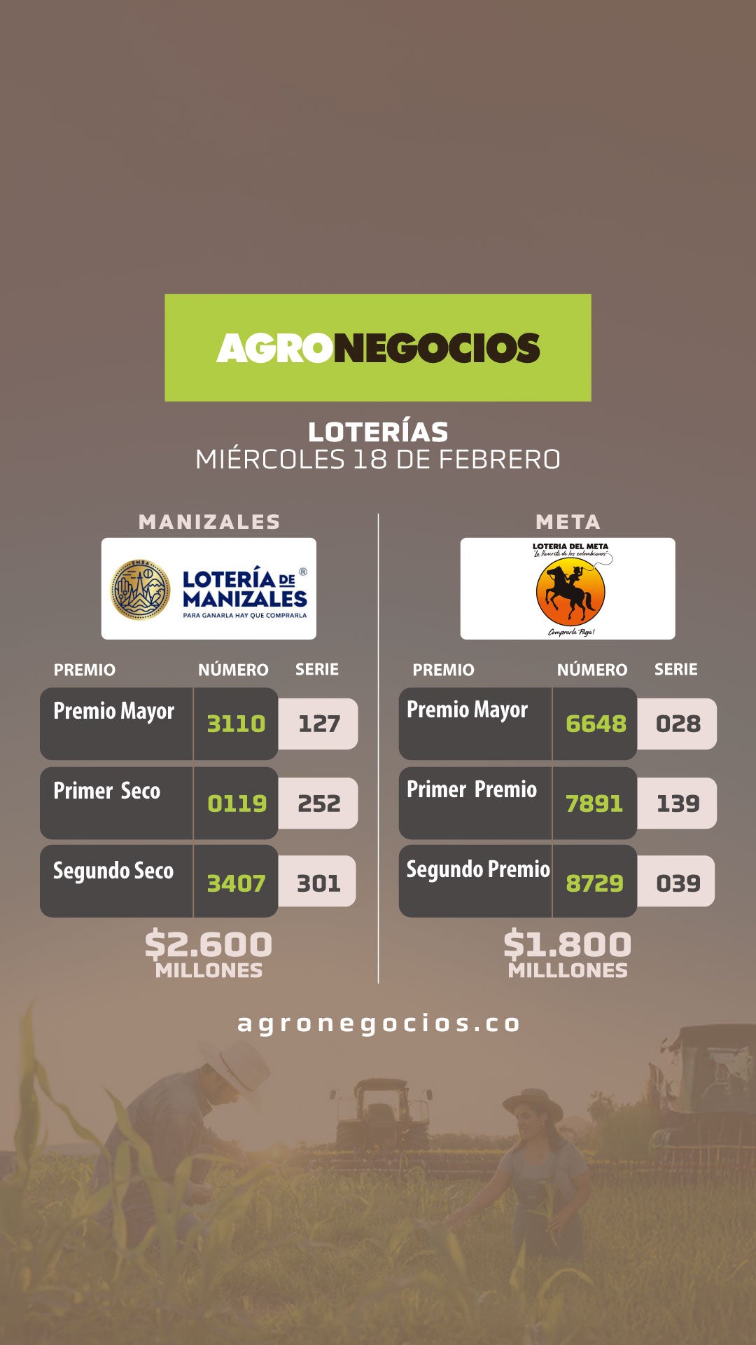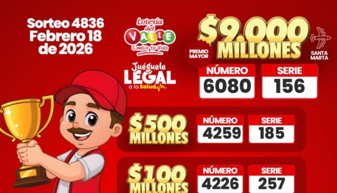 Durante la noche del miércoles 18 de febrero se realizaron los sorteos 4836 de la lotería del Valle, 4943 de la lotería de Manizales y 3286 de la lotería del Meta, con premios mayores de $9.000, $2.600 y $1.800 millones. Esto sin olvidar los secos de $300, $200, $100, $80, $60, $50, $40, $30, $20 y $10 millones.
