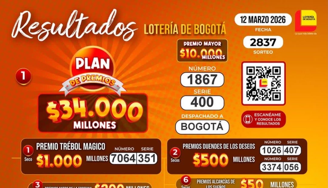 Durante la noche de ayer, jueves 12 de marzo, se llevaron a cabo los sorteos 2837 de la lotería de Bogotá y 3006 de la lotería del Quindío, con premios mayores de $10.000 y $2.000 millones. Estos fueron acompañados de varios secos de $1.000, $500, $300, $200, $100, $50, $20 y $10 millones.