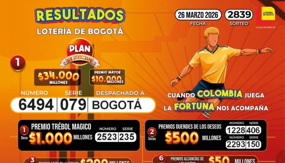 Durante la noche de ayer, jueves 26 de marzo, se llevaron a cabo los sorteos 2839 de la lotería de Bogotá y 3008 de la lotería del Quindío, con premios mayores de $10.000 y $2.000 millones. Estos fueron acompañados de varios secos de $1.000, $500, $300, $200, $100, $50, $20 y $10 millones.