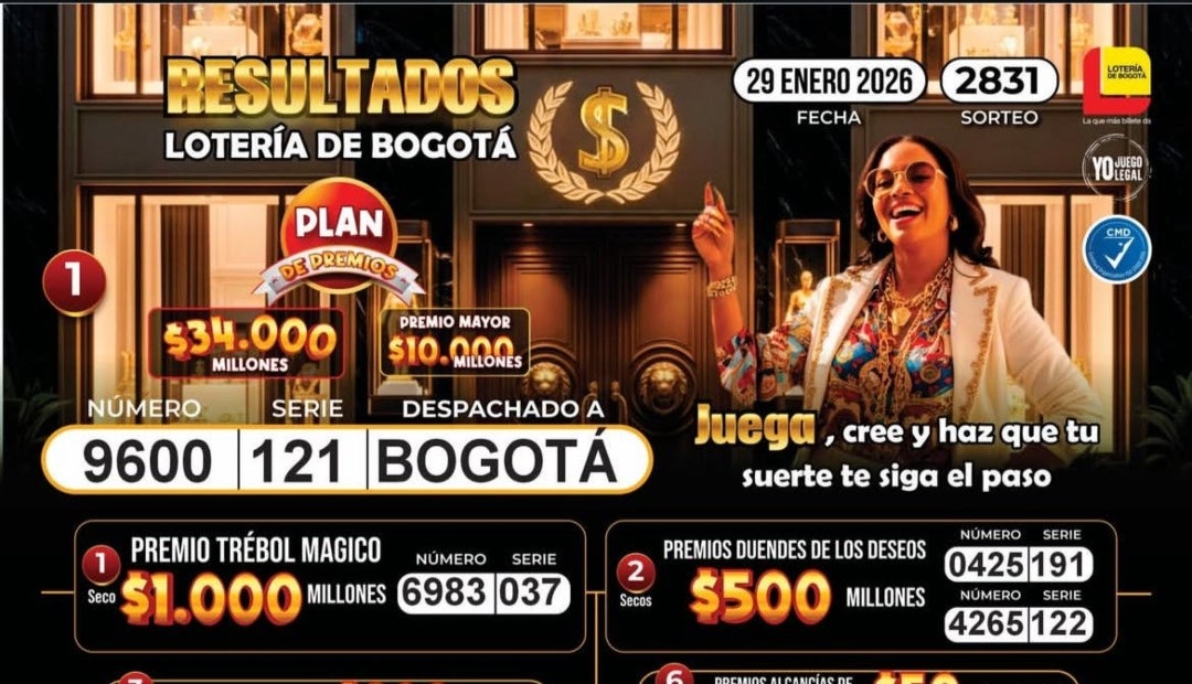La lotería de Bogotá entregó su premio mayor, de $10.000 millones, al número 9600 de la serie 121. También se tuvieron ganadores del Trébol Mágico ($1.000 millones), Duendes de los Deseos ($500 millones), Gatos de la Fortuna ($200 millones), Alcancías de los Sueños ($50 millones), Herraduras Suertudas ($20 millones) y Estrellas Fugaces ($10 millones).