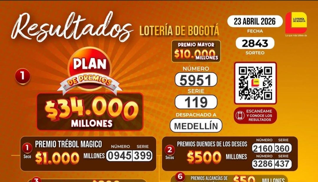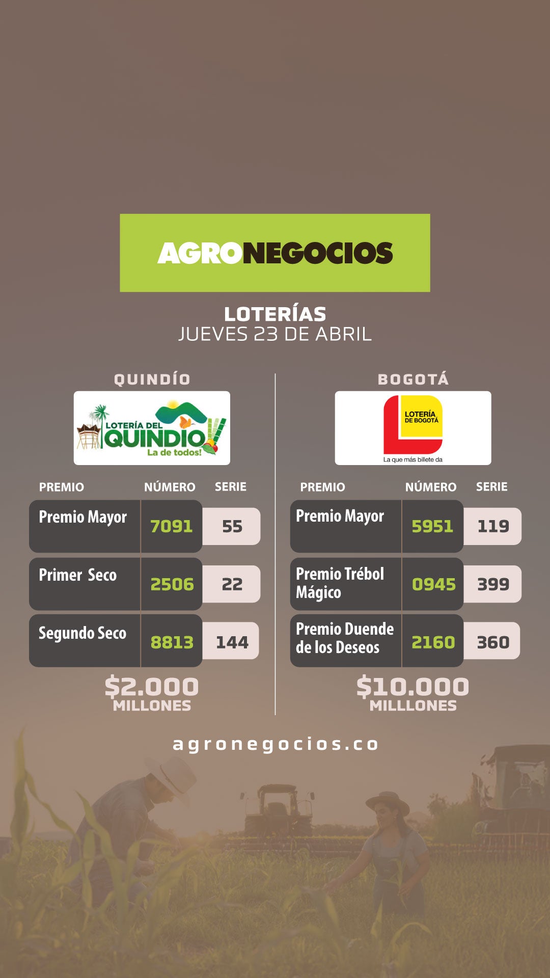Durante la noche del jueves 23 de abril, se llevaron a cabo los sorteos 2843 de la Lotería de Bogotá y 3011 de la Lotería del Quindío, con premios mayores de $10.000 y $2.000 millones. Estos fueron acompañados de varios secos de $1.000, $500, $300, $200, $100, $50, $20 y $10 millones.