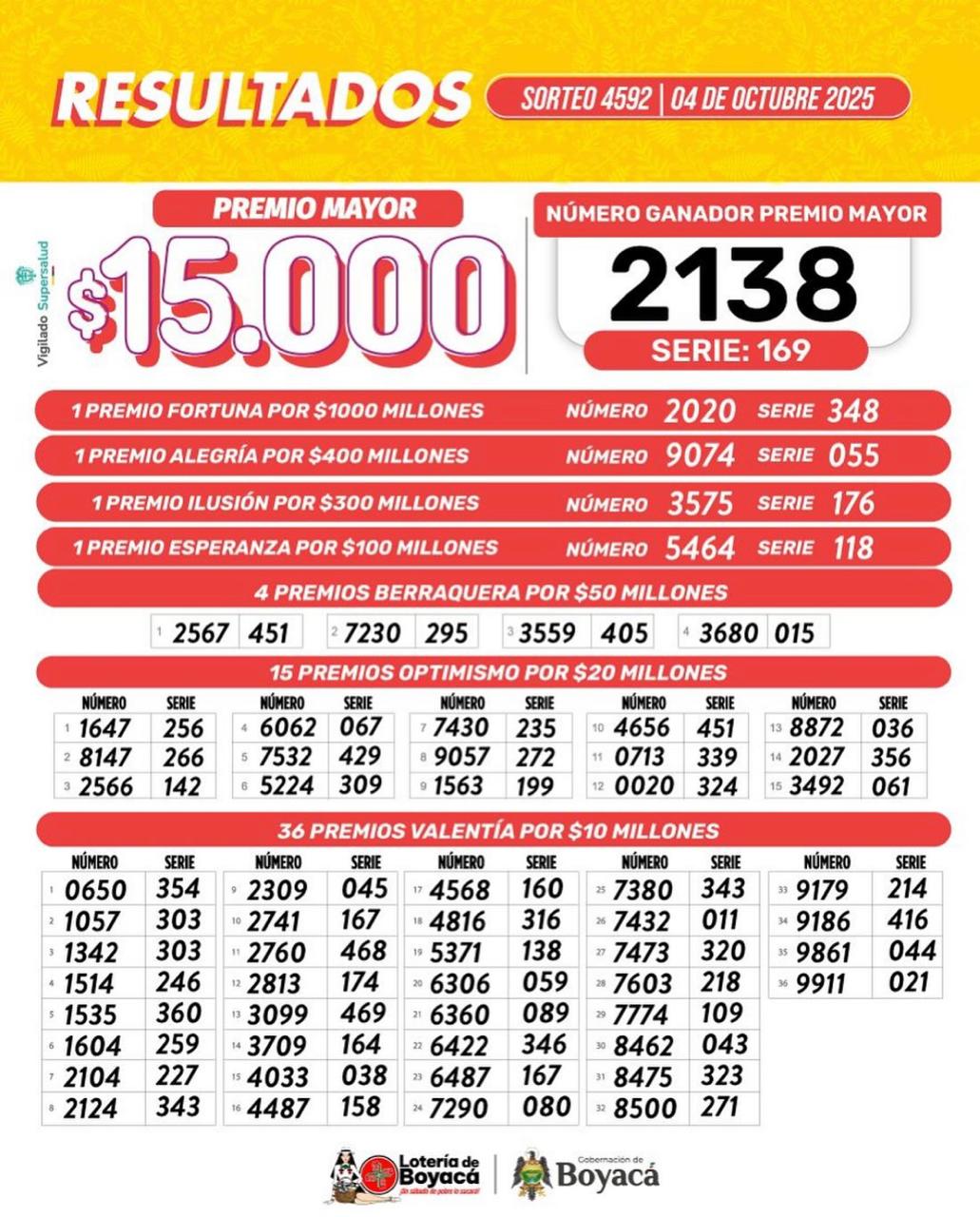 En el sorteo 4592 el ganador del premio mayor, de $15.000 millones fue el número 2138 de la serie 169. También cayeron ganadores de un premio Fortuna ($1.000 millones), uno Alegría ($400 millones), uno Ilusión ($300 millones), uno Esperanza ($100 millones), cuatro Berraquera ($50 millones), 15 Optimismo ($20 millones) y 36 Valentía ($10 millones)