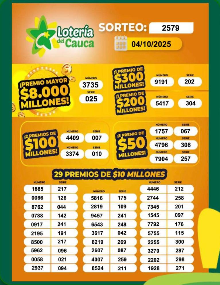 Por otro lado, el número que se llevó el premio mayor, de $8.000 millones, en el sorteo 2579 de la lotería del Cauca fue el 3735 de la serie 025. También se entregaron secos de $300, $200, $100, $50 y $10 millones.