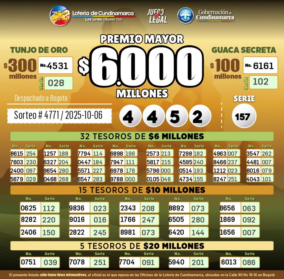La lotería de Cundinamarca tuvo su sorteo 4771, en el que el ganador del premio mayor, de $6.000 millones, se lo llevó el número 4452 de la serie 157. También tuvo ganadores del Tunjo de Oro (300 millones), la Guaca Secreta ($100 millones) y varios tesoros de $20, $10 y $6 millones.