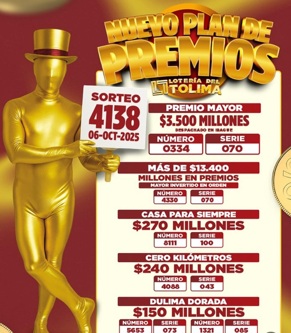 Por otro lado, el número ganador del premio mayor, de $3.500 millones, de la lotería del Tolima fue el 0334 de la serie 070. Además se entregaron su Casa para Siempre ($270 millones), Cero Kilómetros ($240 millones), Dulima Dorada ($150 millones), Top de la Suerte ($60 millones), Tren de la Fortuna ($45 millones), Lluvia de Oro ($21 millones) y Ráfaga Millonaria ($15 millones).