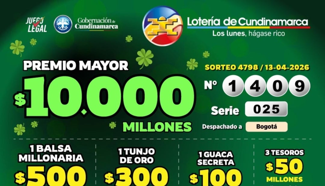 En su sorteo, la lotería de Cundinamarca entregó su premio mayor, de $6.000 millones, al número 1409 de la serie 025. También entregó su Tunjo de Oro ($300 millones), Guaca Secreta ($100 millones), cinco tesoros de $20 millones, 15 tesoros de $10 millones y 32 tesoros de $6 millones.