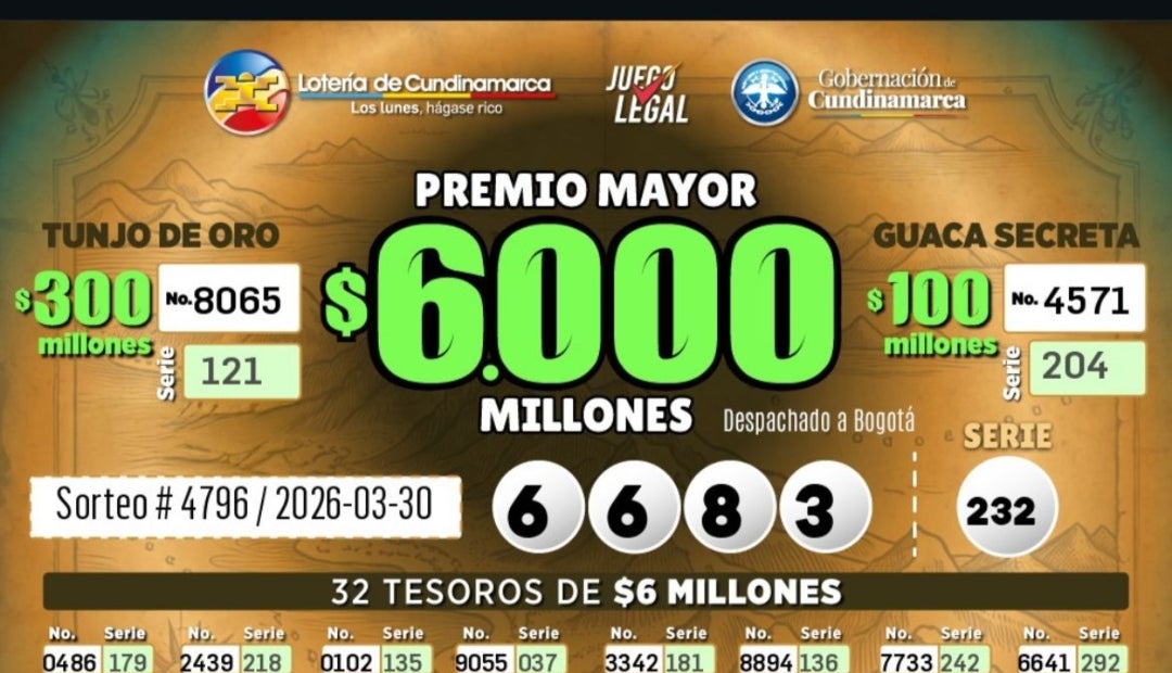 En su sorteo, la lotería de Cundinamarca entregó su premio mayor, de $6.000 millones, al número 6683 de la serie 232. También entregó su Tunjo de Oro ($300 millones), Guaca Secreta ($100 millones), cinco tesoros de $20 millones, 15 tesoros de $10 millones y 32 tesoros de $6 millones.