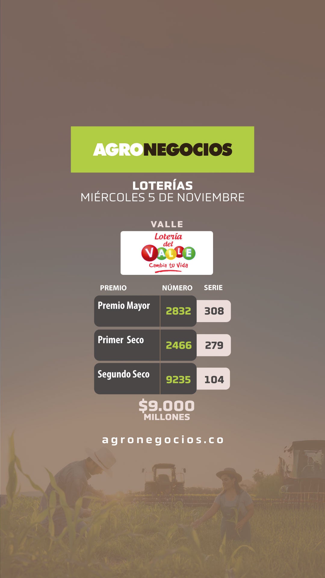 Por último, la lotería del Valle entregó su premio mayor, de $9.000 millones, al número 2832 de la serie 308, acompañado de secos de $500, $100, $60, $40 y $30 millones.