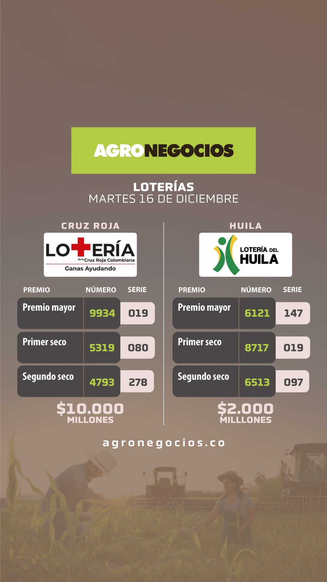 Durante la noche del martes 16 de diciembre se realizaron los sorteos 3132 de la lotería de la Cruz Roja y 4734 de la lotería del Huila, con premios mayores de $10.000 y $2.000 millones. A la vez, los sorteos tuvieron premios secos de $200, $150, $100, $30, $20 $15 y $10 millones.