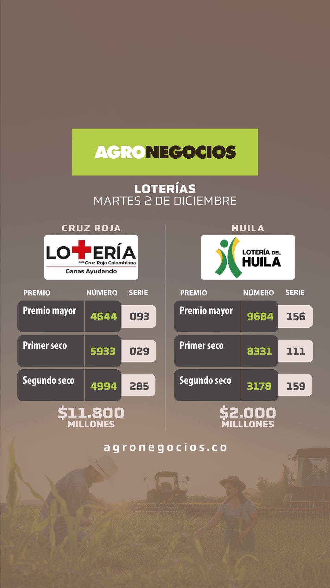 Durante la noche del martes 2 de diciembre se realizaron los sorteos 3130 de la lotería de la Cruz Roja y 4732 de la lotería del Huila, con premios mayores de $11.800 y $2.000 millones. A la vez, los sorteos tuvieron premios secos de $200, $150, $100, $30, $20 $15 y $10 millones.