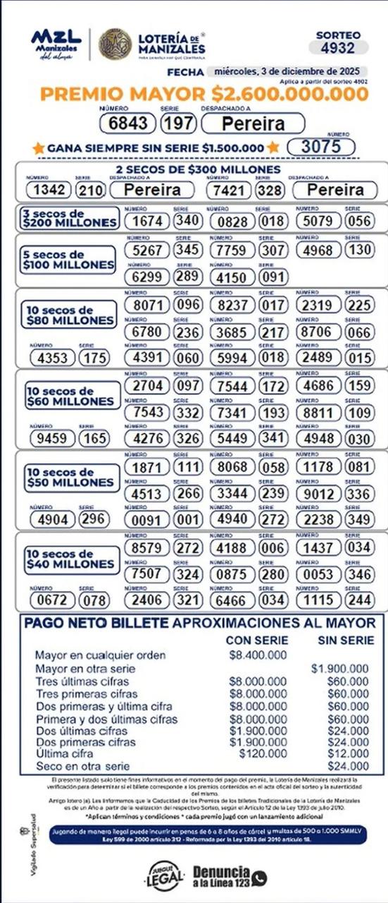 El ganador del premio mayor, de $2.600 millones, de la lotería de Manizales fue el número 6843 de la serie 197. También se tuvieron ganadores de secos de $300, $200, $100, $80, $60, $50 y $40 millones.