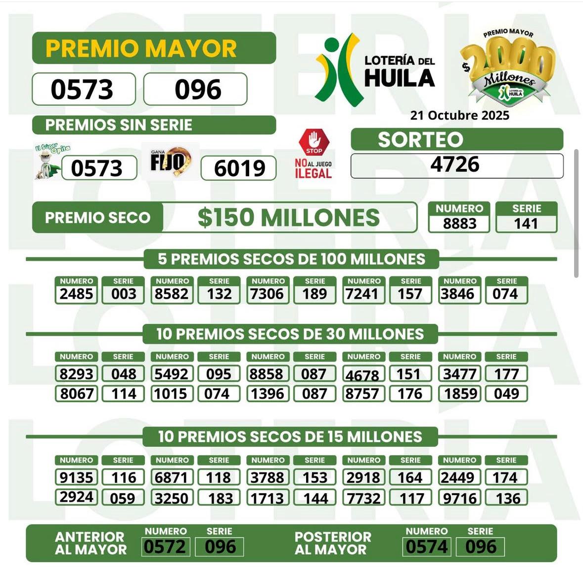 Por otro lado, la lotería del Huila entregó su premio mayor, de $2.000 millones, al número 0573 de la serie 096. Además entregaron secos de $150, $100, $30 y $15 millones.