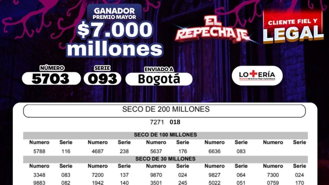 El número ganador del premio mayor, de $7.000 millones, de la lotería de la Cruz Roja fue el 5703 de la serie 093. El sorteo también tuvo ganadores de secos de $200, $100, $30, $20 y $10 millones.