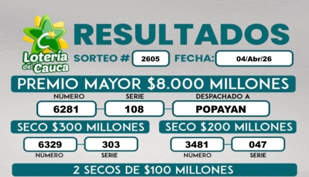 Por último, el número 6281 de la serie 108 fue el ganador del premio mayor, de $8.000 millones, del sorteo 2599 de la lotería del Cauca. Esto sin olvidar los secos de $300, $200, $100, $50 y $10 millones.
