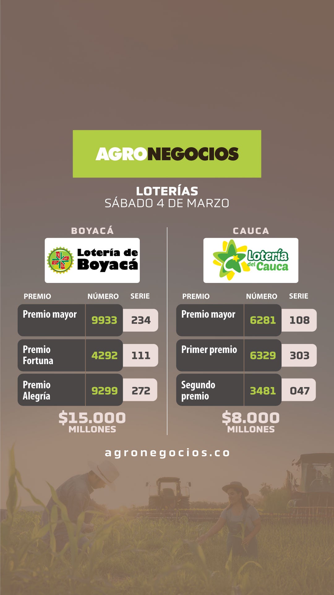 Durante la noche del sábado 04 de abril se realizaron los sorteos 4618 de la lotería de Boyacá y 2605 de la lotería del Cauca con premios mayores de $15.000 y $8.000 millones. También cayeron secos de $1.000, $400, $300, $200, $100, $50, $20 y $10 millones.