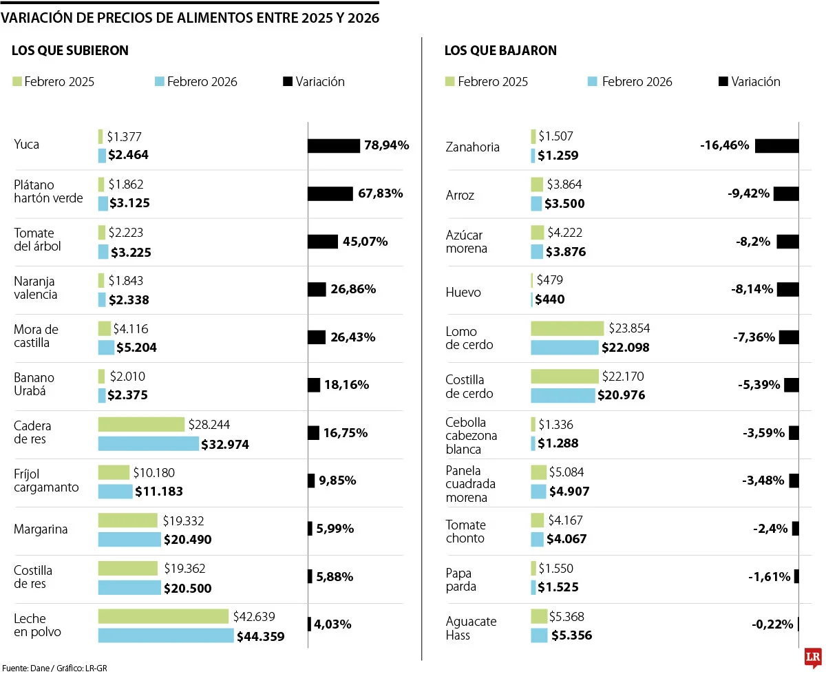 Entre los productos que más subieron de precio se destacan la yuca, el plátano hartón verde y el tomate de árbol. El kilo de yuca pasó de $1.377 a $2.464, lo que representó un incremento de 78,9%.