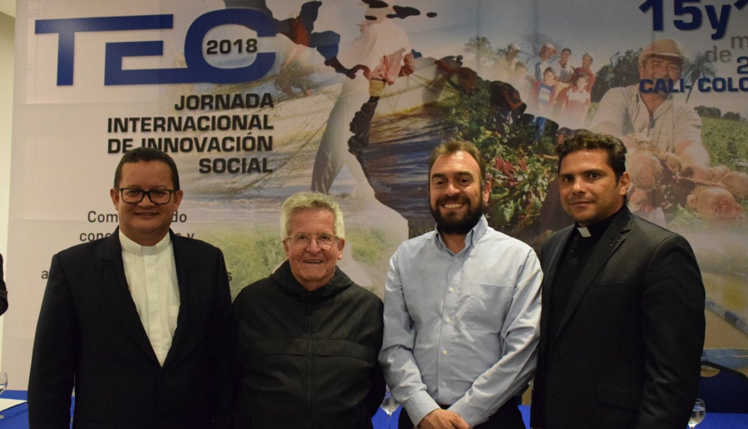 El Parque Científico de la Innovación Social de Uniminuto a través de la rectoría Valle, organizó el evento TEC2018 Jornada de Innovación Social pensada en la agricultura familiar en América Latina. El evento contó con la presencia de emprendedores, representantes de organizaciones sociales, directivos de la organización Minuto de Dios, académicos y dirigentes del sector agrícola del país y la región, entre otros invitados. En la imagen, el padre Harold Castilla, rector general de Uniminuto; padre Diego Jaramillo, presidente de la Organización Minuto de Dios; Juan Fernando Pacheco, gerente Parque Científico de Innovación Social; y padre Orlando Hernández, rector de Uniminuto en su sede de Valle del Cauca.