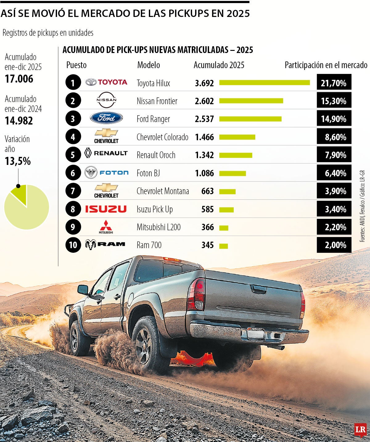 La venta de pickups en Colombia creció un 13,5% respecto a 2024, según el informe del sector automotor que publican de manera conjunta la Andi y Fenalco. En total fueron 17.006 unidades las que se comercializaron el año pasado, frente a las 14.982 de 2024.